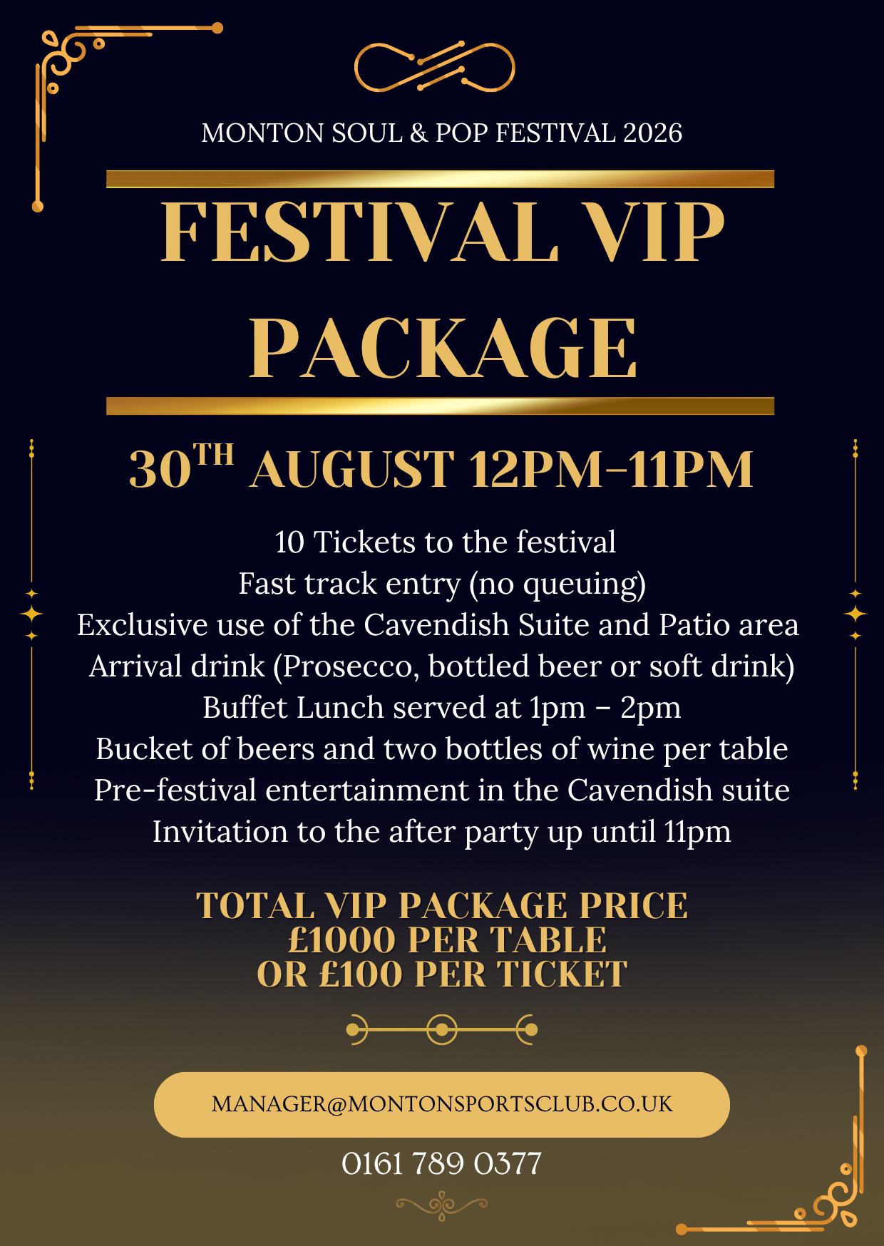 Experience the Monton Soul & Pop Festival in style! VIP tables available for £1000 for a table of 10 or £100 per ticket. Limited numbers are available so contact manager@montonsportsclub.co.uk or ring 0161 789 0377 to book yours before they sell out!