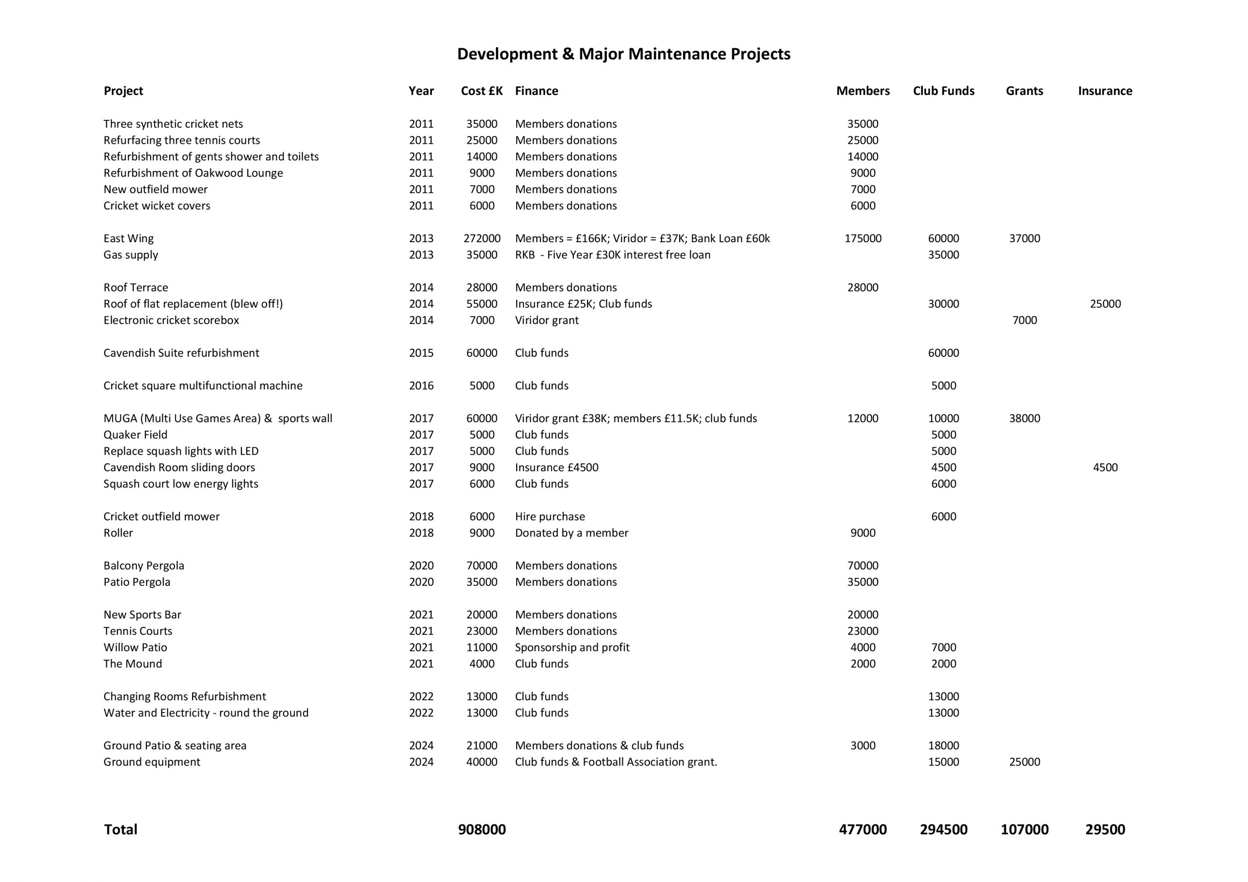All the above major development projects are summarised in the table to the right, along with some that were less substantial, and major maintenance projects included.