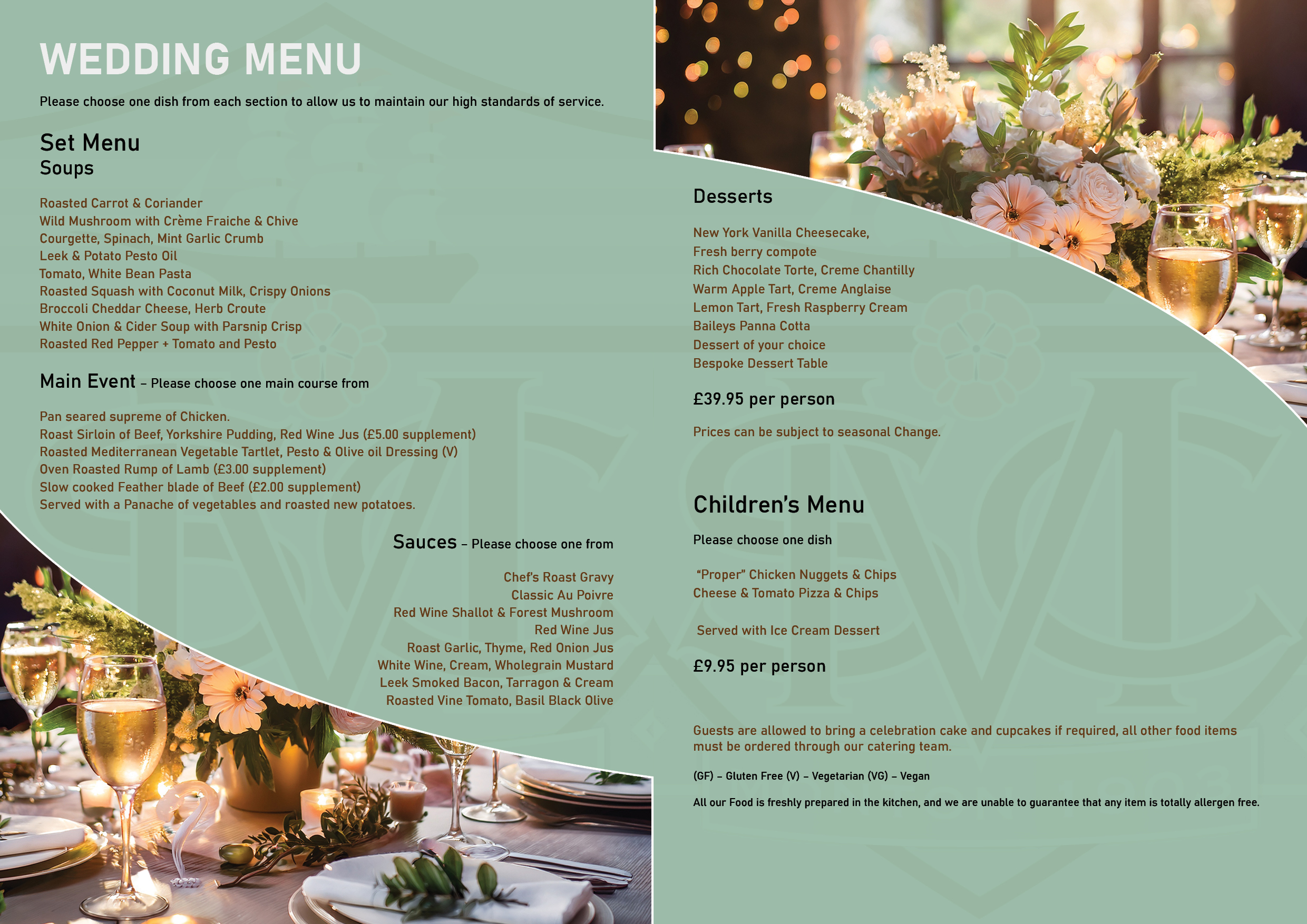 Our outstanding and highly recommended Catering Partner will cater for your every need, whether that is canapes on arrival, hot & chilled buffets, children’s menus as well as sit down two, three or four course possibilities. Our team will work with you on a bespoke menu.